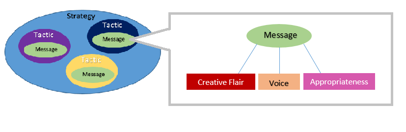 Strategy is the overarching term; different tactics are represented with different colors. However, the message should remain the same between tactics, so it is represented in green throughout the diagram.